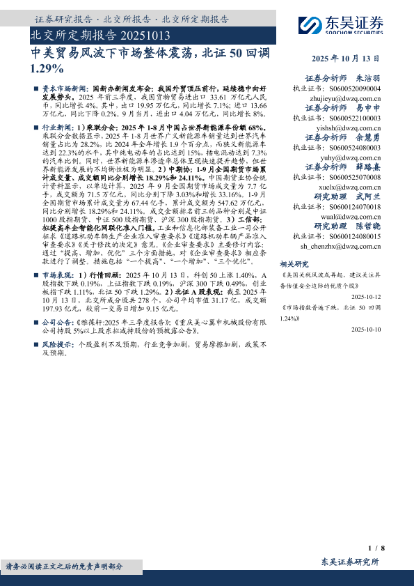 【东吴证券】【202510】中美贸易风波下市场整体震荡,北证 50回调1.29%-8页