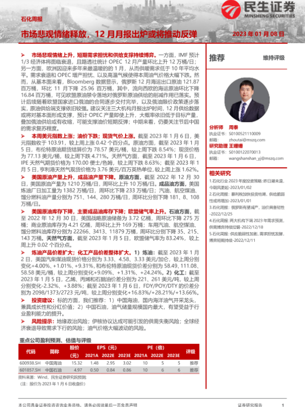 【民生证券】【20230108】石化周报:市场悲观情绪释放,12月月报出炉或将推动反弹-27页