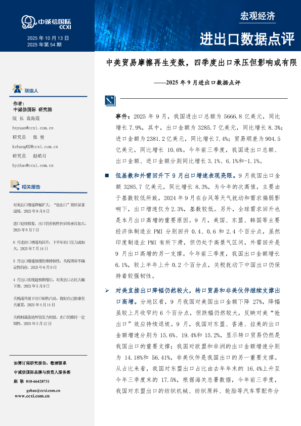 【中诚信国际】【202510】2025年9月进出口数据点评:中美贸易摩擦再生变数,四季度出口承压但影响或有限-7页