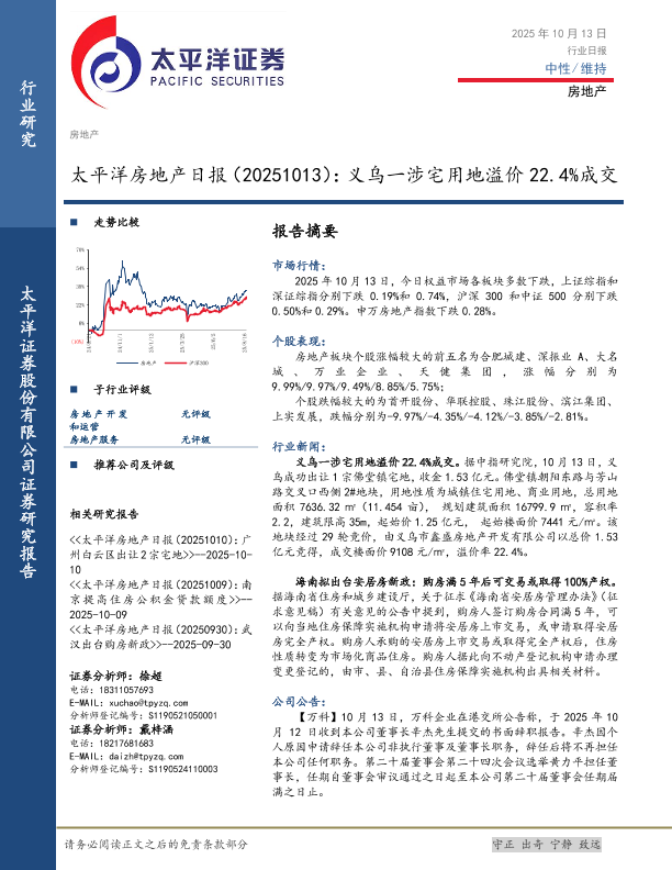【太平洋证券】【202510】太平洋房地产日报(20251013):义乌一涉宅用地溢价 22.4%成交-4页