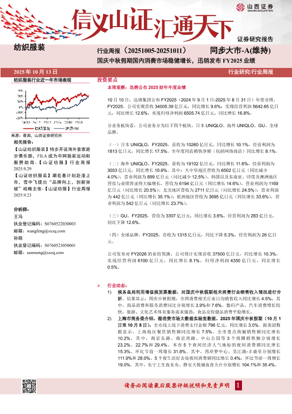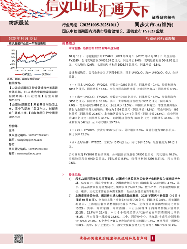 纺织服装 消费市场 迅销集团 业绩分析 行业周报