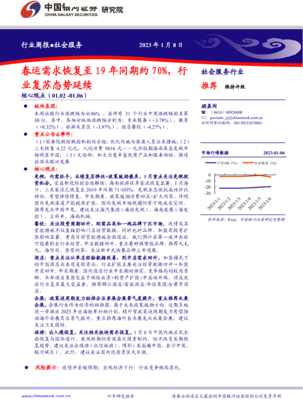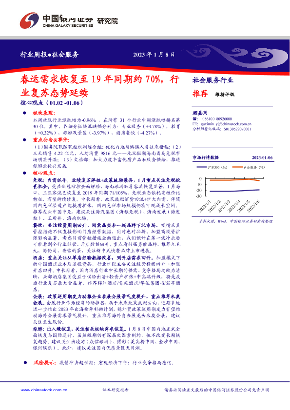 【银河证券】【20230108】社会服务行业周报:春运需求恢复至19年同期约70%,行业复苏态势延续-14页