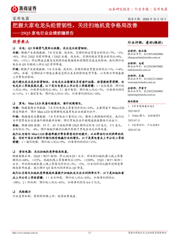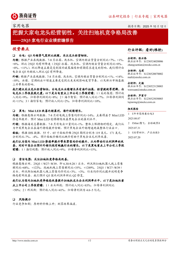【浙商证券】【202510】把握大家电龙头经营韧性,关注扫地机竞争格局改善——25Q3家电行业业绩前瞻报告-2页