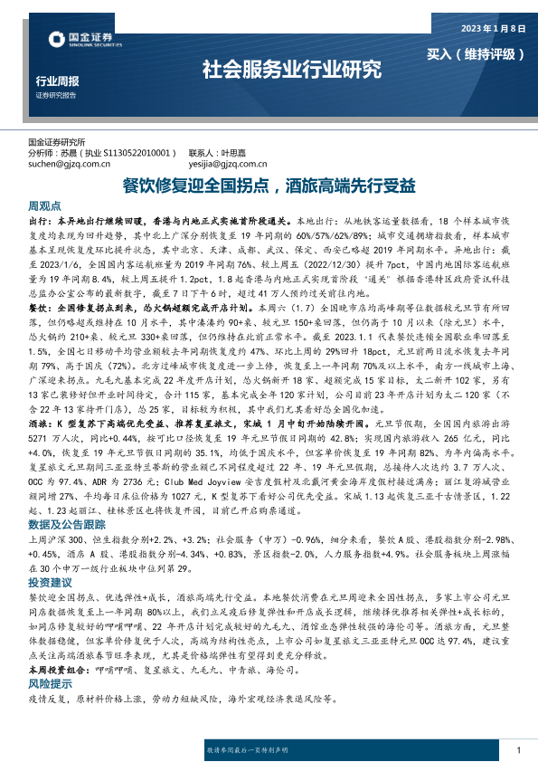 【国金证券】【20230108】社会服务行业周报:餐饮修复迎全国拐点,酒旅高端先行受益-18页