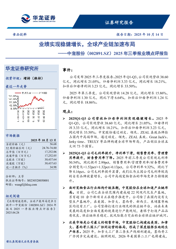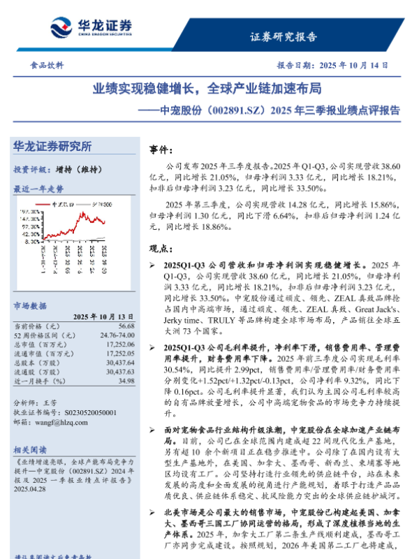 【华龙证券】【202510】业绩实现稳健增长,全球产业链加速布局——中宠股份(002891.SZ)2025年三季报业绩点评报告-4页