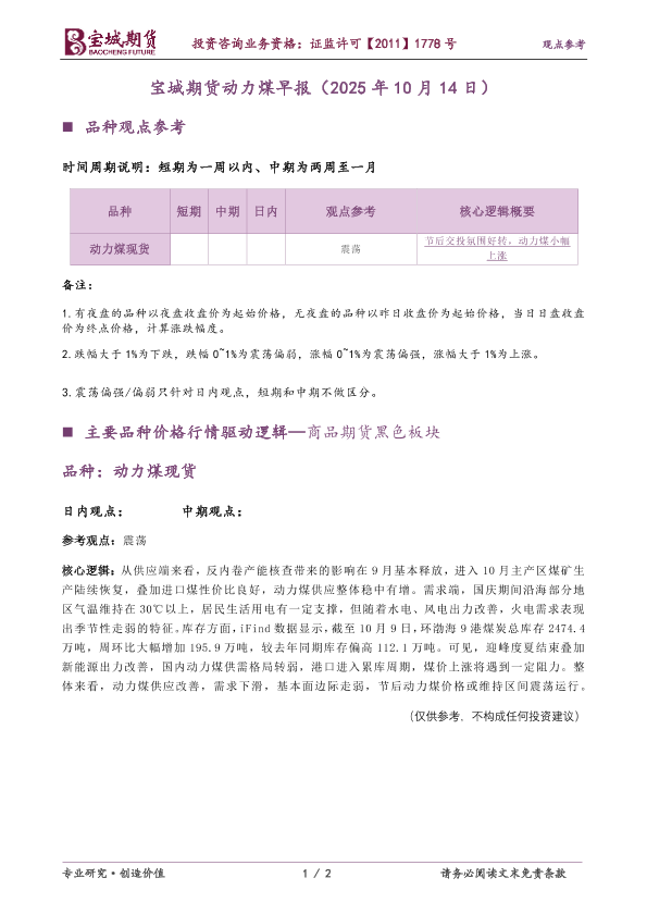 【宝城期货】【202510】宝城期货动力煤早报(2025年 10月 14日)-2页