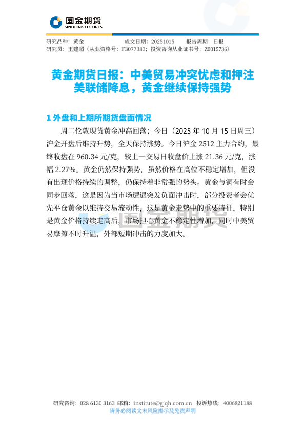【国金期货】【202510】黄金期货日报 中美贸易冲突忧虑和押注美联储降息,黄金继续保持强势-4页