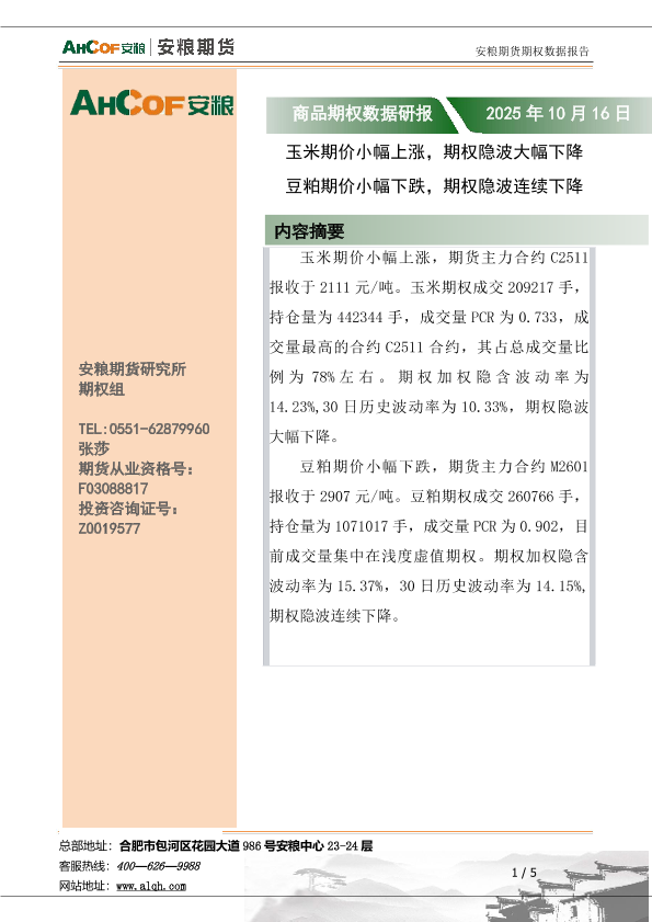 【安粮期货研究所】【202510】商品期权数据研报 2025年 10月 16日-5页