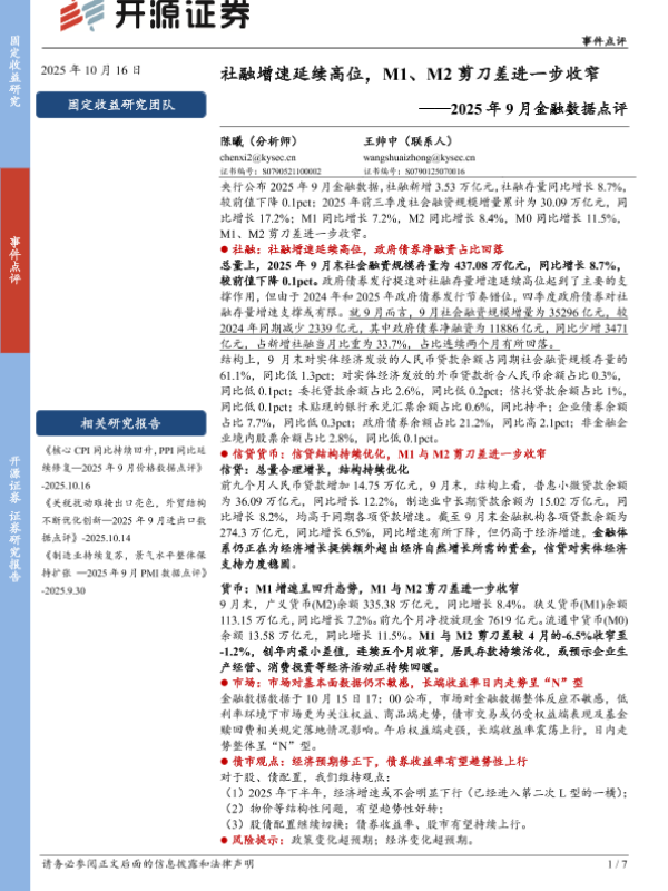 【开源证券】【202510】社融增速延续高位,M1、M2剪刀差进一步收窄——2025年9月金融数据点评-7页