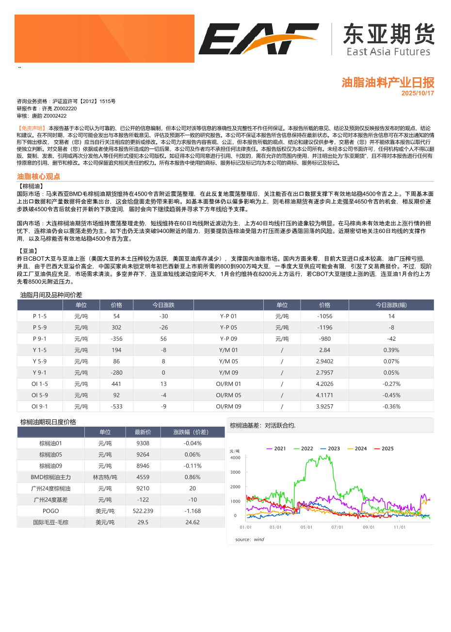 棕榈油 豆油 期现价差 菜粕 豆粕