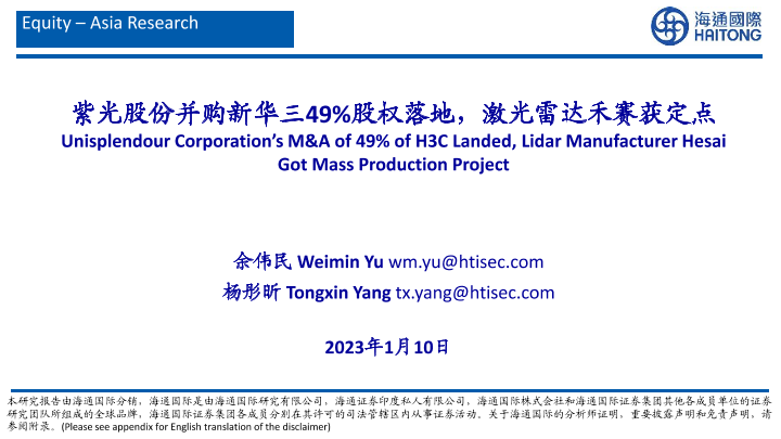 【海通国际】【20230110】紫光股份并购新华三49%股权落地,激光雷达禾赛获定点-29页