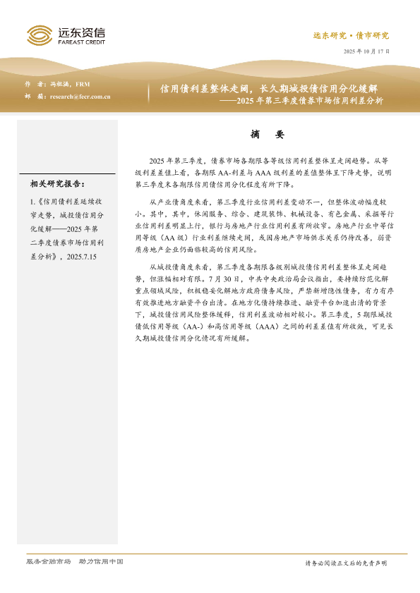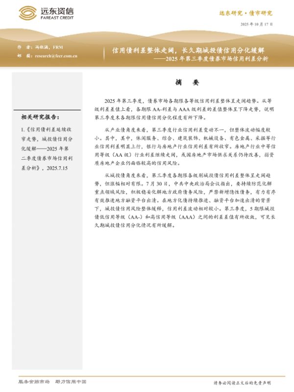 【远东资信】【202510】信用债利差整体走阔,长久期城投债信用分化缓解——2025年第三季度债券市场信用利差分析-11页