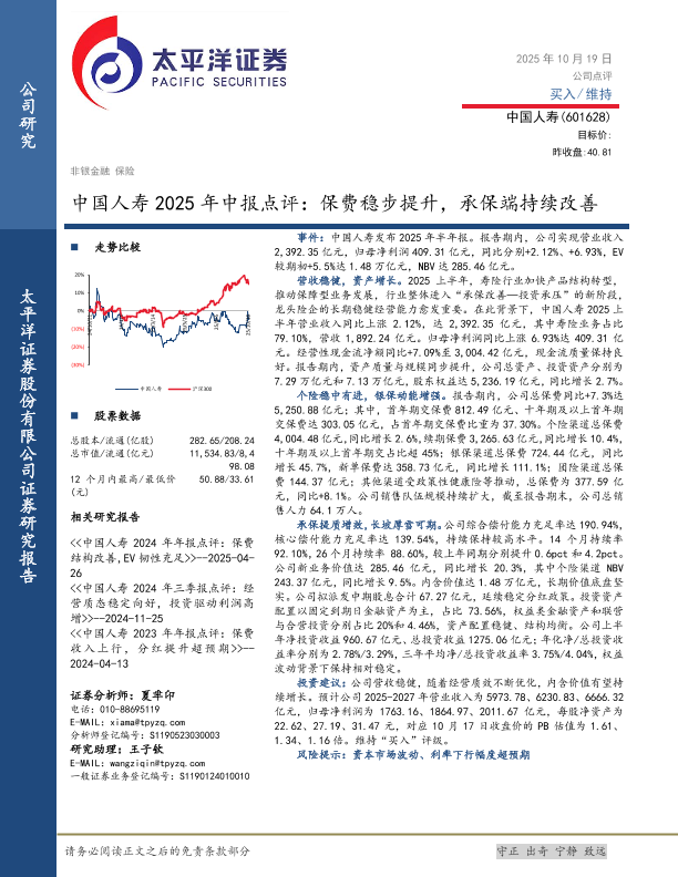 【太平洋证券】【202510】中国人寿2025年中报点评:保费稳步提升,承保端持续改善-4页