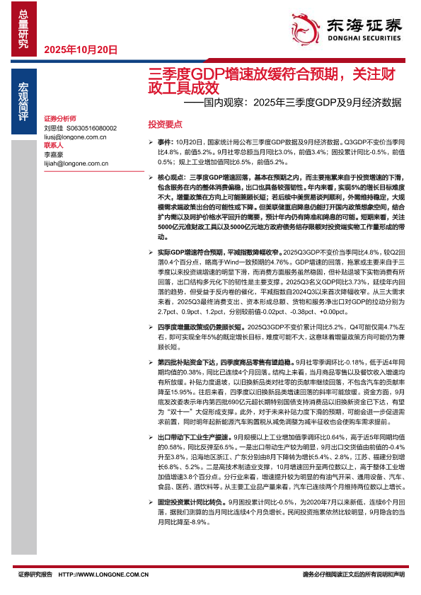 【东海证券】【202510】三季度GDP增速放缓符合预期,关注财政工具成效——国内观察:2025年三季度GDP及9月经济数据-6页