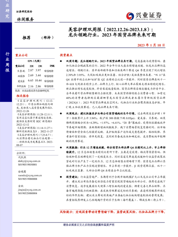 【兴业证券】【20230110】美容护理双周报:龙头领跑行业,2023年国货品牌未来可期-22页