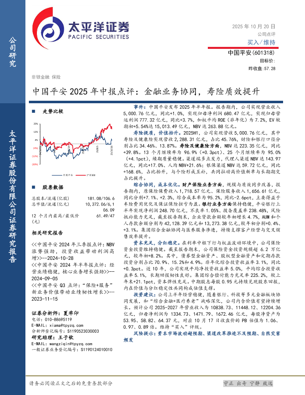【太平洋证券】【202510】中国平安2025年中报点评:金融业务协同,寿险质效提升-4页
