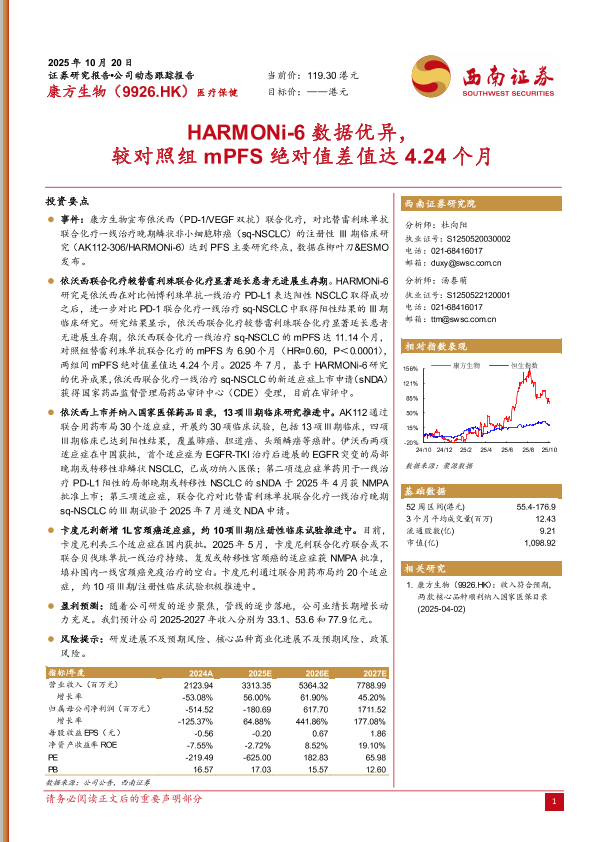 【西南证券】【202510】康方生物(9926.HK)医疗保健 目标价:——港元 HARMONi-6数据优异, 较对照组 mPFS绝对值差值达 4.24个月-6页