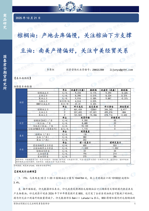 【国泰君安期货】【202510】棕榈油:产地去库偏慢,关注棕油下方支撑;豆油:南美产情偏好,关注中美经贸关系-3页