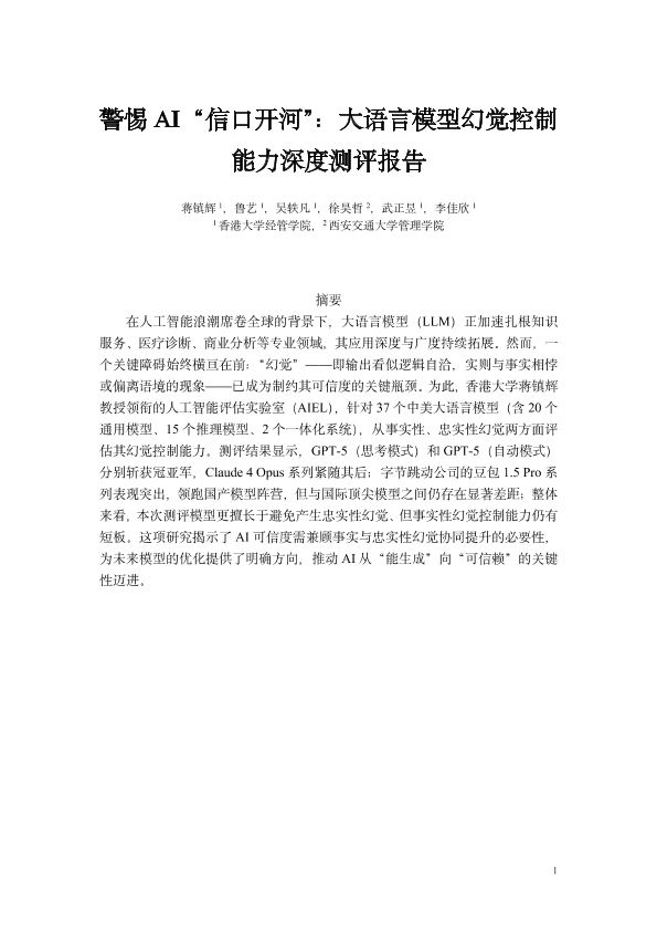 【香港大学经管学院&西安交通大学管理学院】【2025】警惕 AI“信口开河”:大语言模型幻觉控制 能力深度测评报告-12页