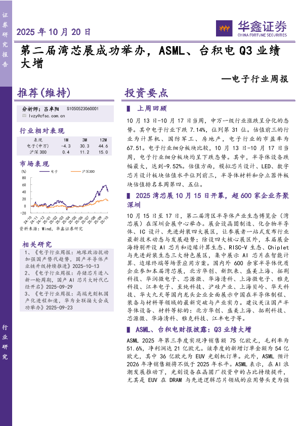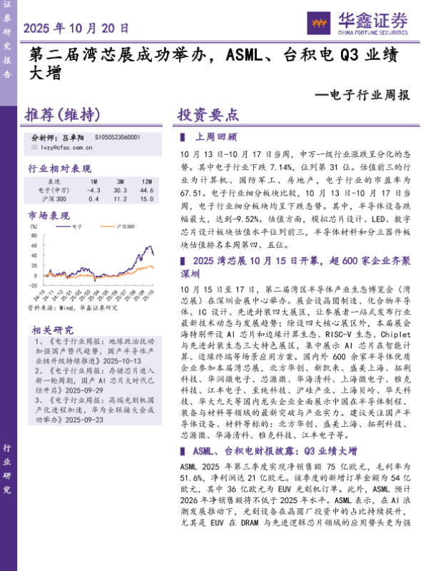 【华鑫证券】【202510】电子行业周报:第二届湾芯展成功举办,ASML、台积电Q3业绩大增-28页