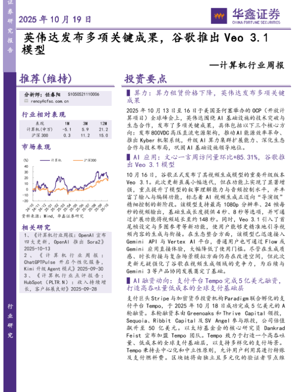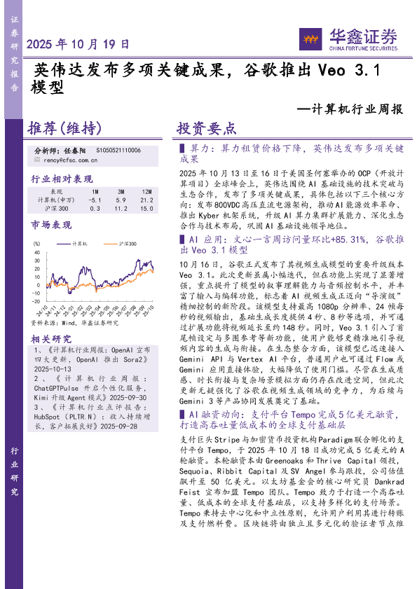 【华鑫证券】【202510】计算机行业周报:英伟达发布多项关键成果,谷歌推出Veo 3.1模型-19页