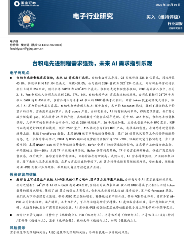 【国金证券】【202510】电子周观点:台积电先进制程需求强劲,未来AI需求指引乐观-9页