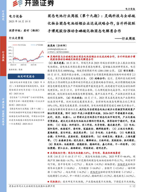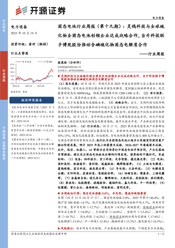 【开源证券】【202510】电力设备行业固态电池行业周报(第十九期):灵鸽科技与全球硫化物全固态电池创领企业达成战略合作,当升科技联手博苑股份推动含碘硫化物固态电解质合作-12页