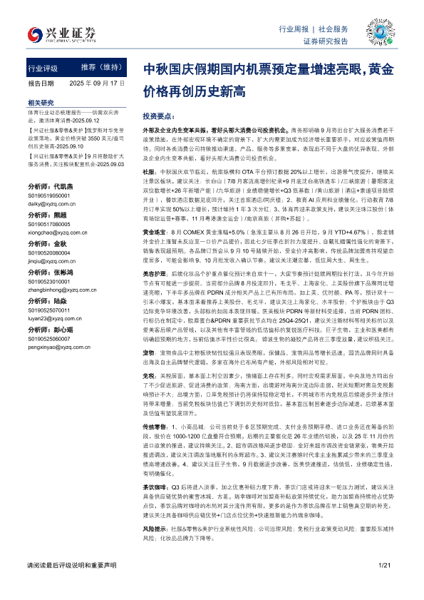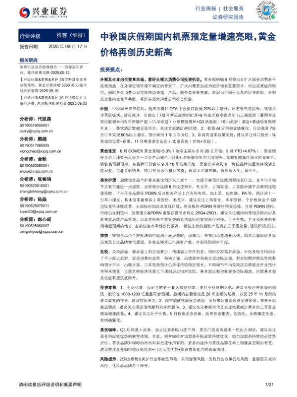 【兴业证券】【202509】社会服务行业周报:中秋国庆假期国内机票预定量增速亮眼,黄金价格再创历史新高-21页