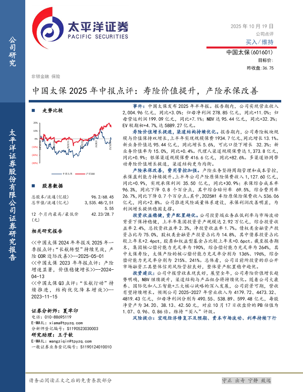 【太平洋证券】【202510】中国太保2025年中报点评:寿险价值提升,产险承保改善-4页
