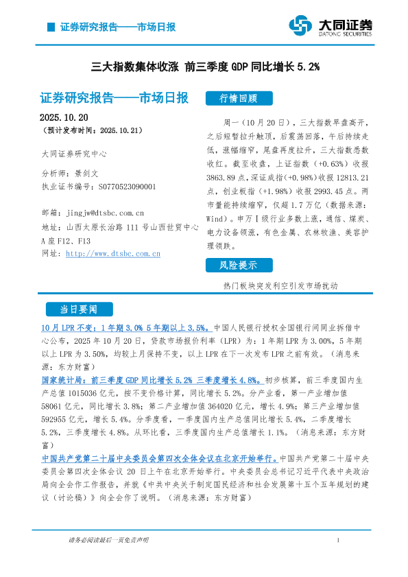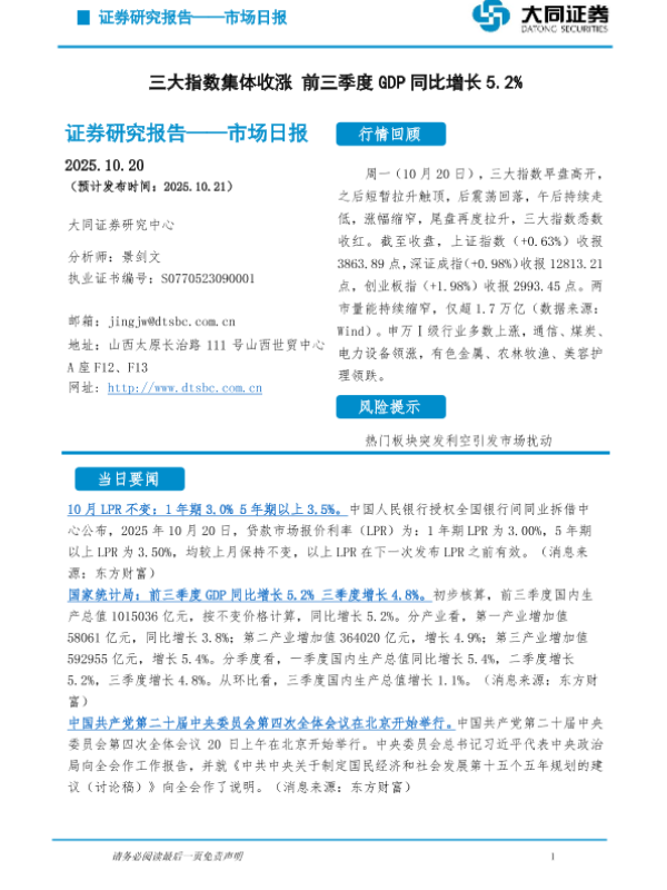 【大同证券研究中心】【202510】市场日报_三大指数集体收涨_前三季度GDP同比增长5.2-5页