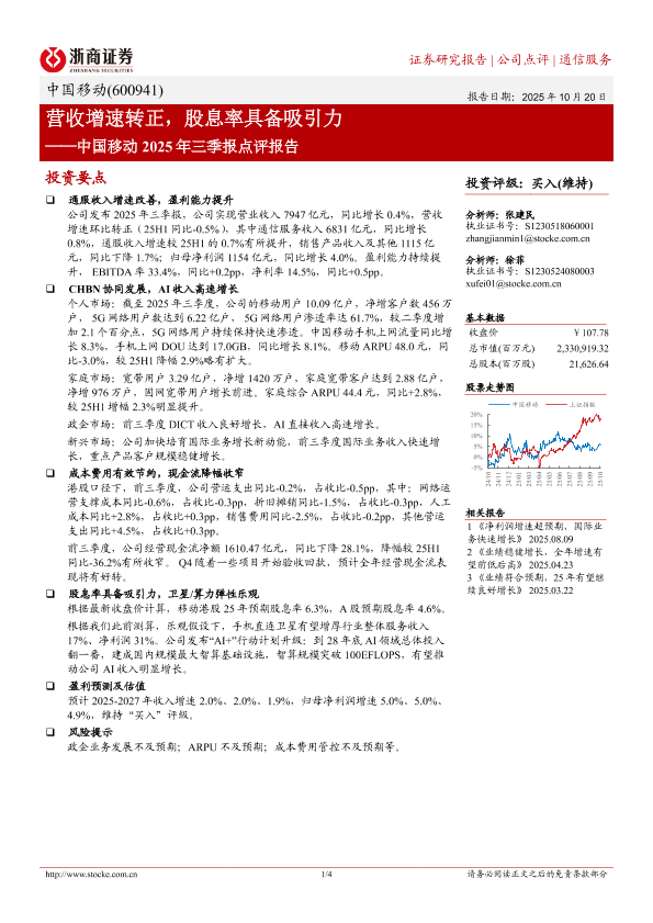 【浙商证券】【202510】营收增速转正,股息率具备吸引力——中国移动 2025年三季报点评报告-4页
