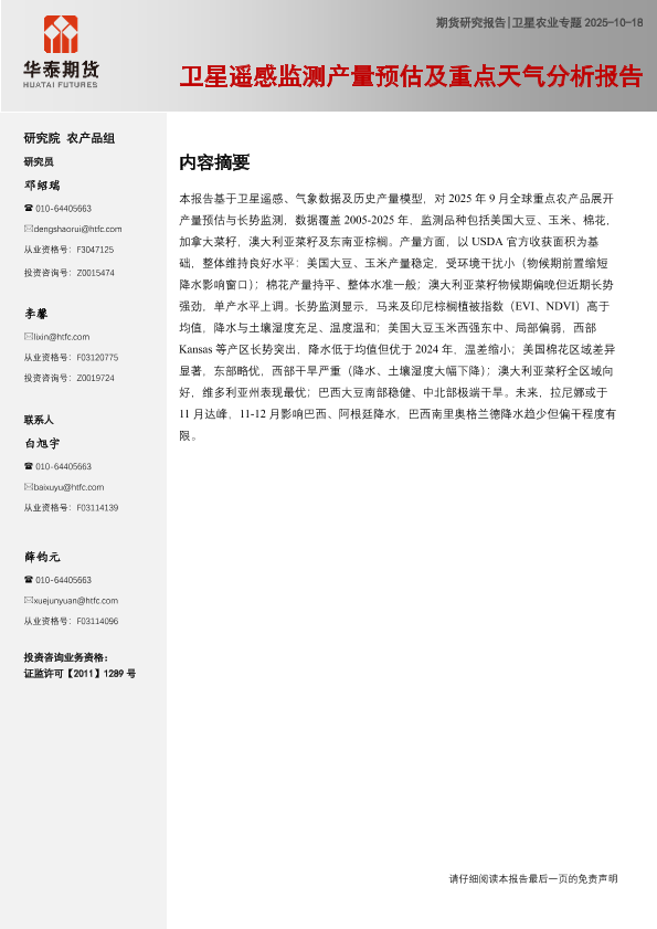 【华泰期货】【202510】卫星遥感监测产量预估及重点天气分析报告-20页