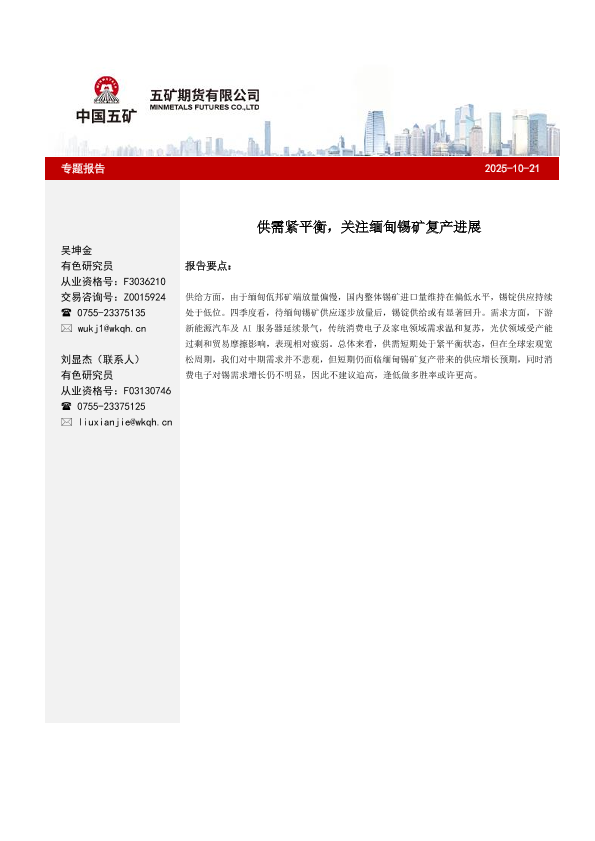 【五矿期货】【202510】供需紧平衡,关注缅甸锡矿复产进展-4页