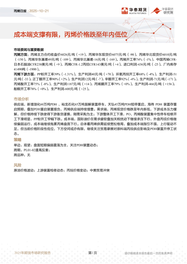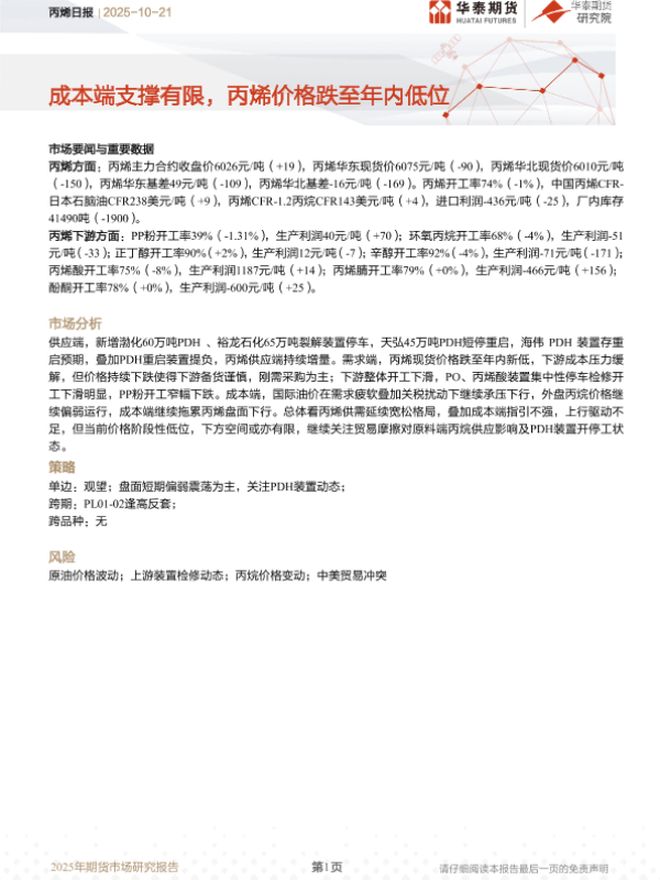 【华泰期货】【202510】丙烯日报_成本端支撑有限_丙烯价格跌至年内低位-10页