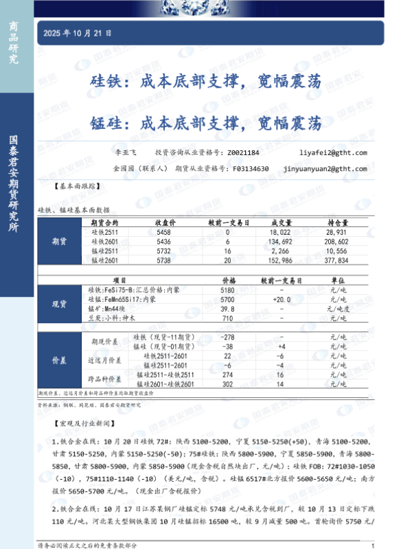 【国泰君安期货】【202510】硅铁:成本底部支撑,宽幅震荡 锰硅:成本底部支撑,宽幅震荡-3页