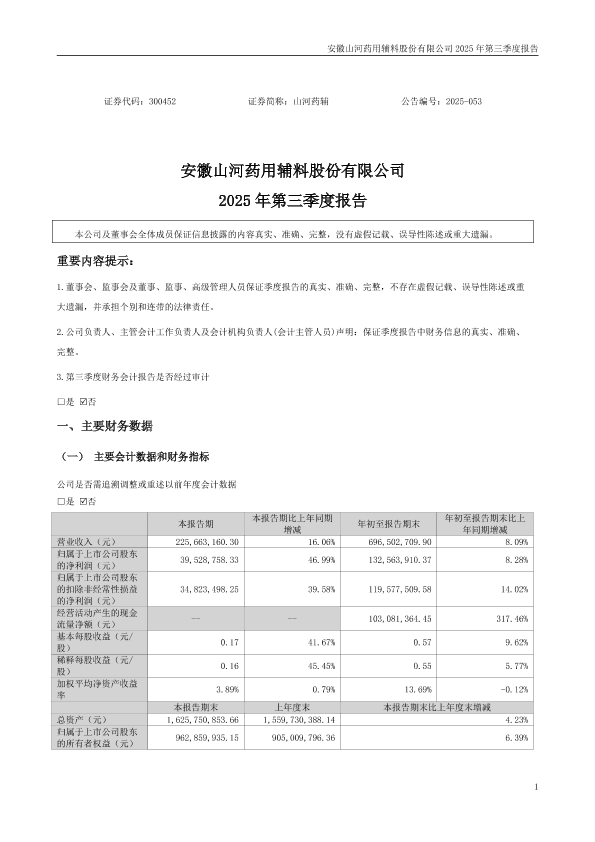 【安徽山河药用辅料股份有限公司】【2025】山河药辅:2025年三季度报告-10页