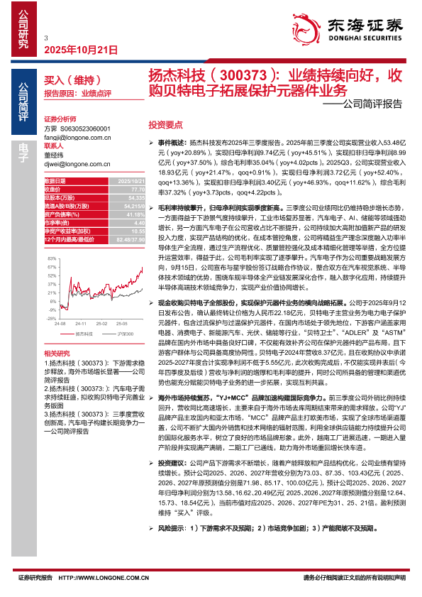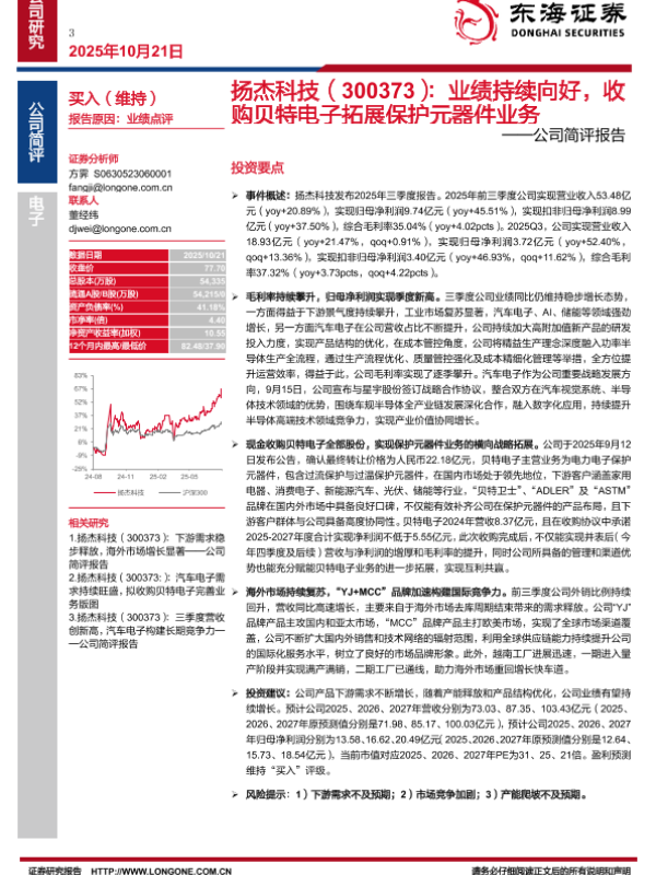 【东海证券】【202510】扬杰科技(300373):业绩持续向好,收购贝特电子拓展保护元器件业务-4页
