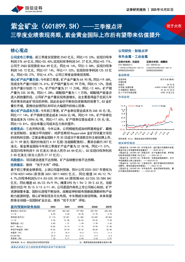 【国信证券】【202510】优于大市 紫金矿业(601899.SH)——三季报点评 三季度业绩表现亮眼,紫金黄金国际上市后有望带来估值提升-8页