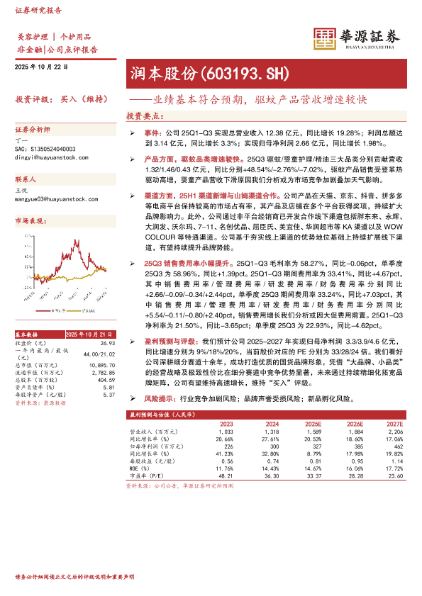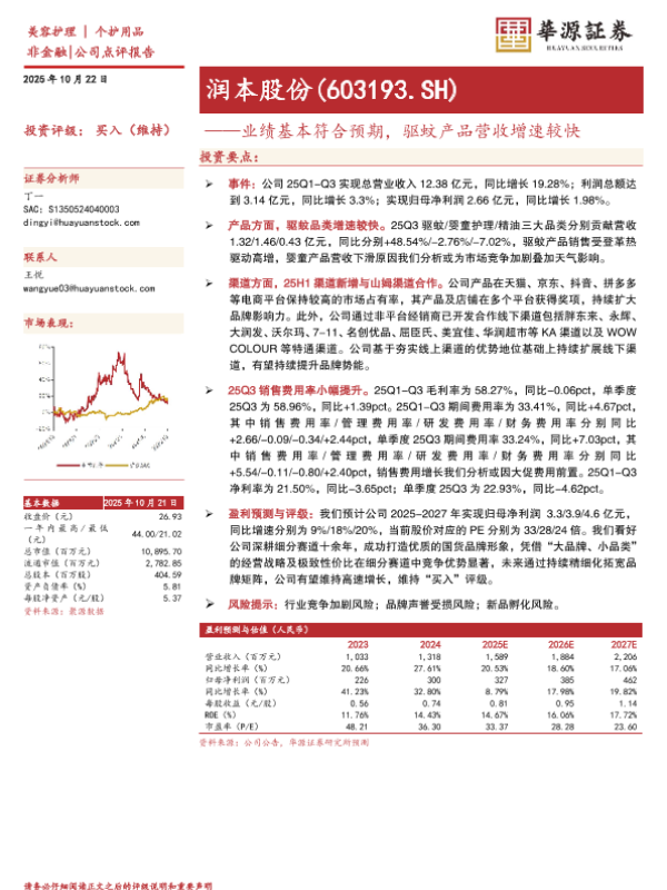 【华源证券】【202510】润本股份(603193.SH)——业绩基本符合预期,驱蚊产品营收增速较快-3页