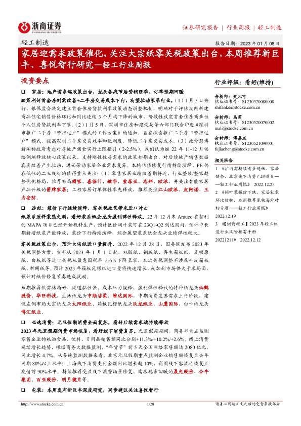【浙商证券】【20230108】轻工行业周报:家居迎需求政策催化,关注大宗纸零关税政策出台-28页