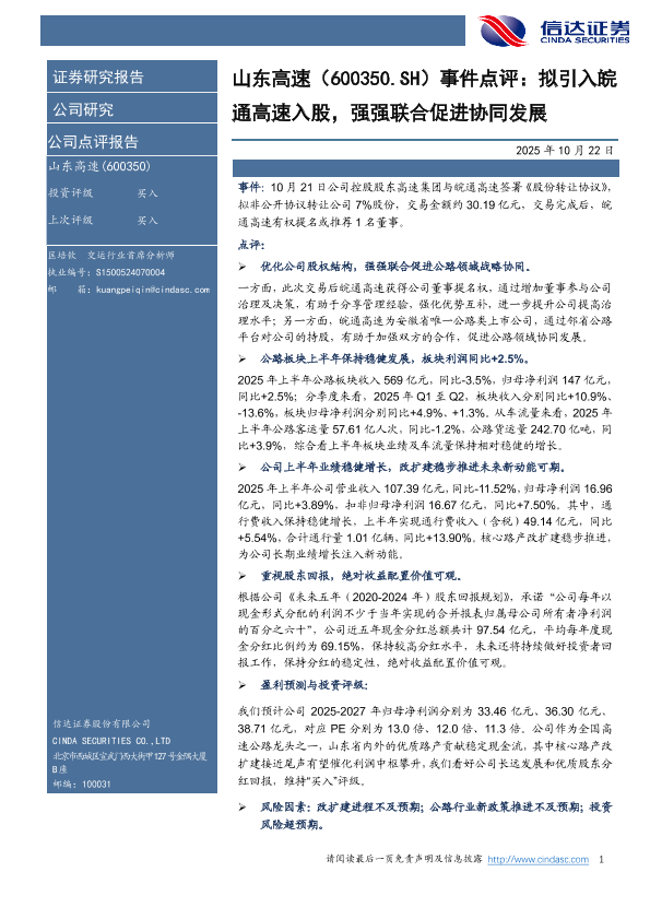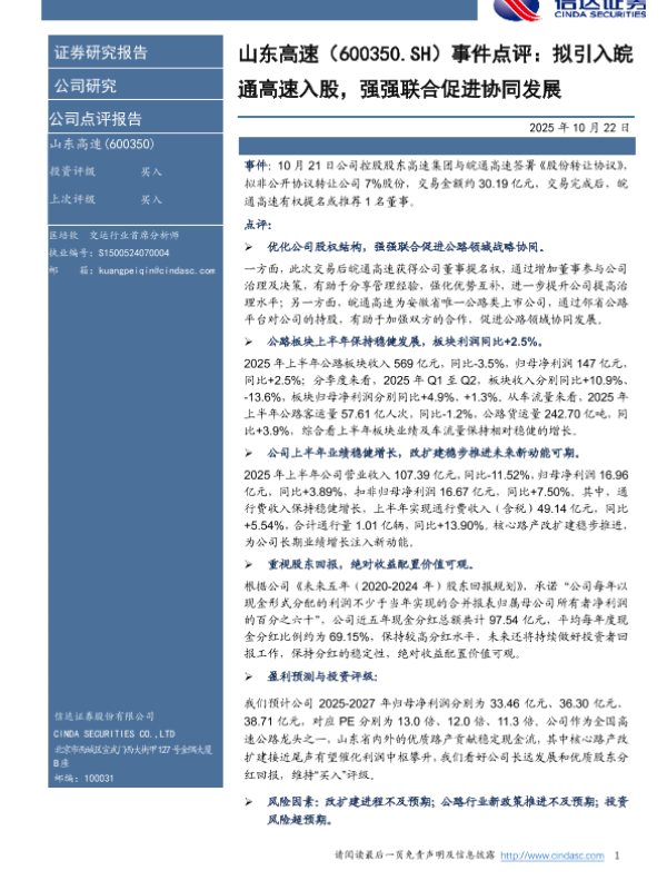 【信达证券】【202510】山东高速(600350.SH)事件点评:拟引入皖通高速入股,强强联合促进协同发展-5页