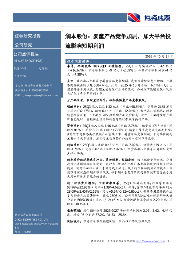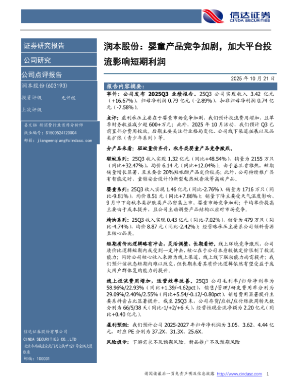 【信达证券】【202510】润本股份:婴童产品竞争加剧,加大平台投流影响短期利润-5页