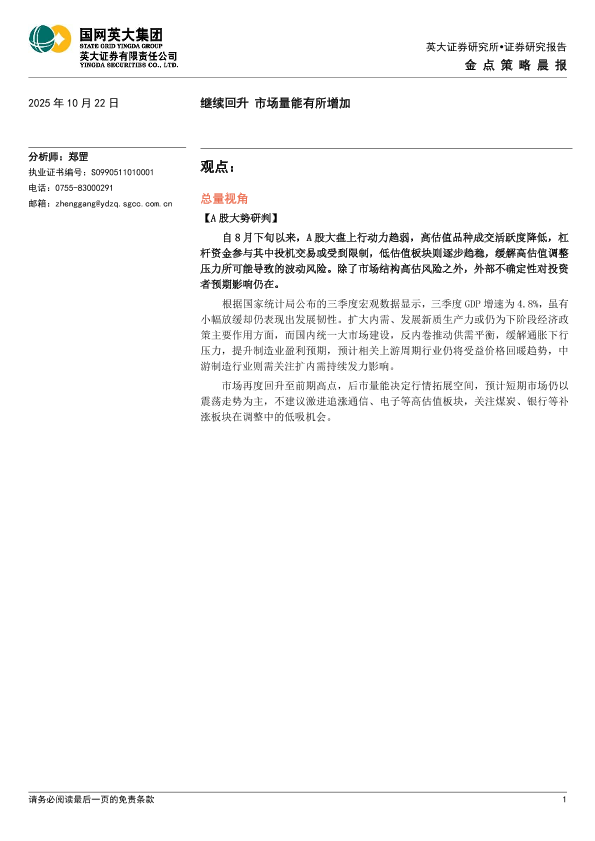 【英大证券】【202510】金点策略晨报:继续回升 市场量能有所增加-4页