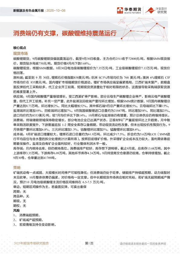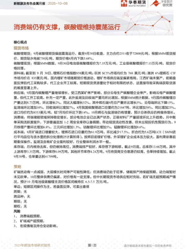 【华泰期货】【202510】新能源及有色金属月报 | 消费端仍有支撑,碳酸锂维持震荡运行-17页