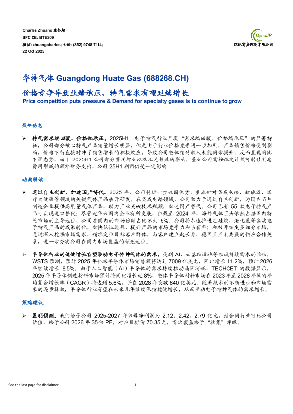 【环球富盛理财有限公司】【202510】价格竞争导致业绩承压_特气需求有望延续增长-6页