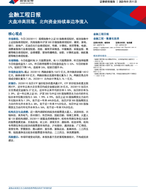 【国信证券】【20230111】金融工程日报:大盘冲高回落,北向资金持续单边净流入-16页