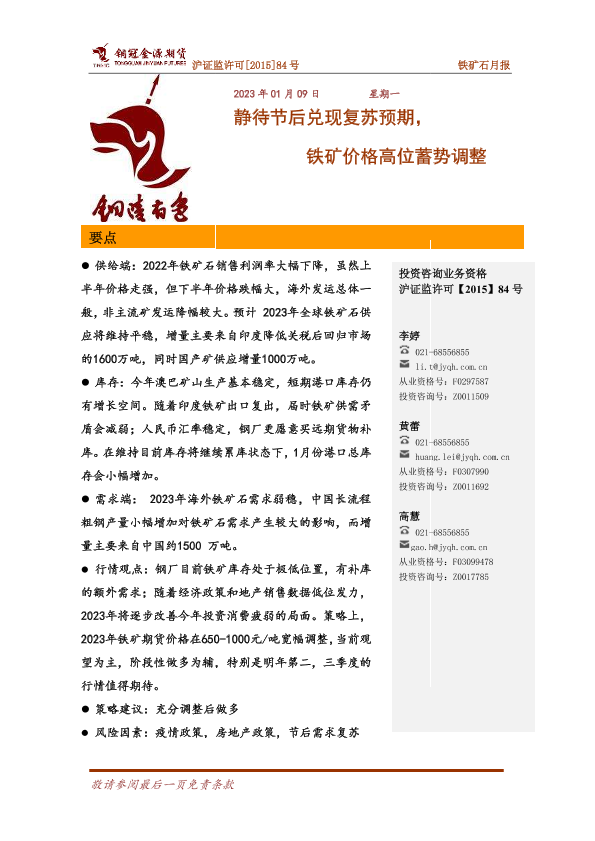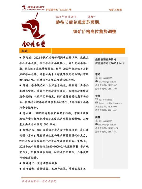 【铜冠金源期货】【20230109】铁矿石月报:静待节后兑现复苏预期,铁矿价格高位蓄势调整-16页