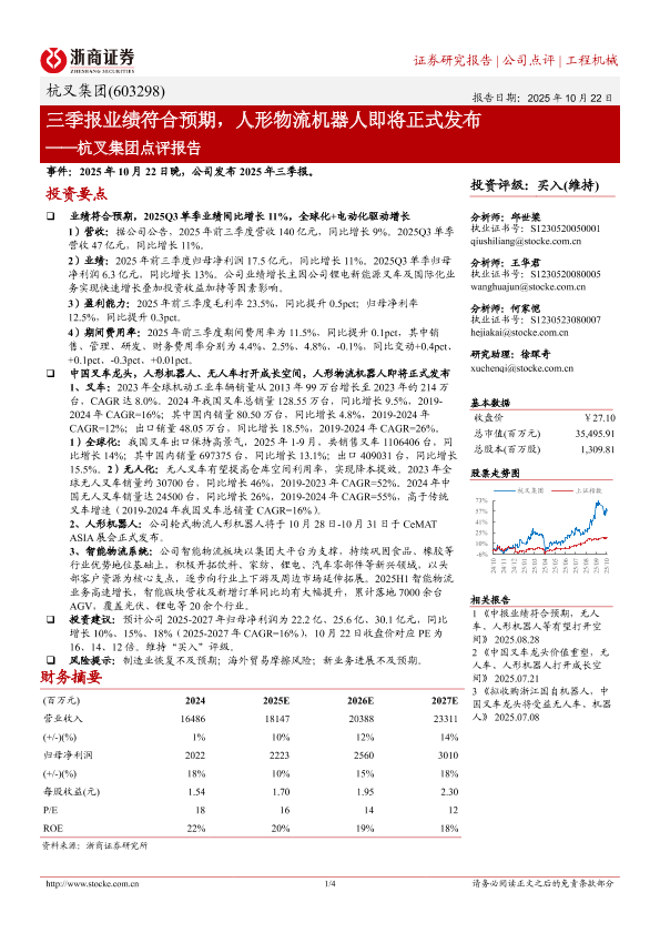 【浙商证券】【202510】三季报业绩符合预期,人形物流机器人即将正式发布——杭叉集团点评报告-4页