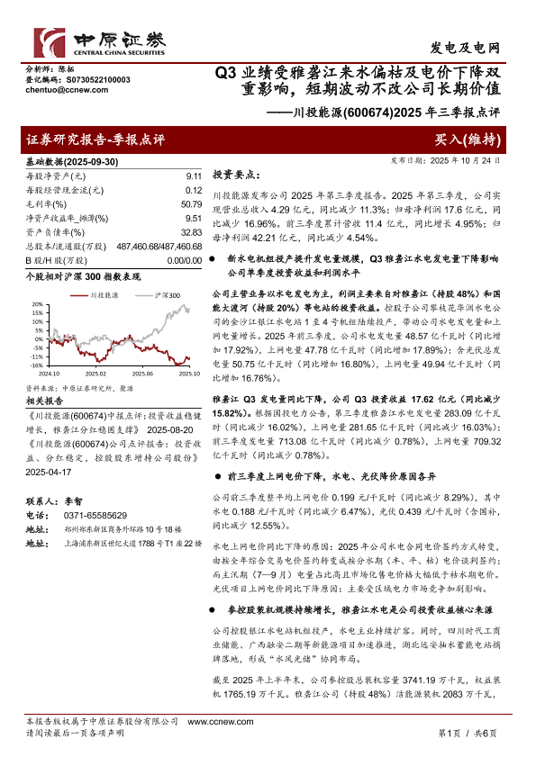 【中原证券】【202510】Q3业绩受雅砻江来水偏枯及电价下降双重影响,短期波动不改公司长期价值——川投能源(600674)2025年三季报点评-6页