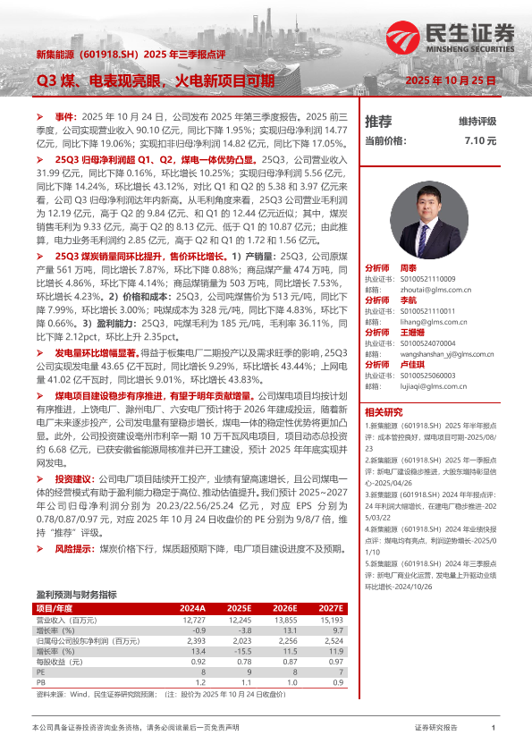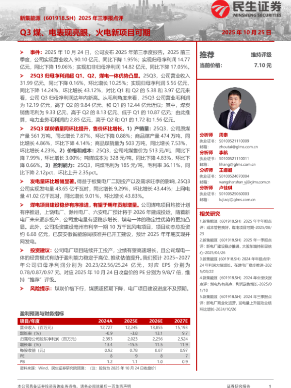 【民生证券】【202510】2025年三季报点评:Q3煤、电表现亮眼,火电新项目可期-3页
